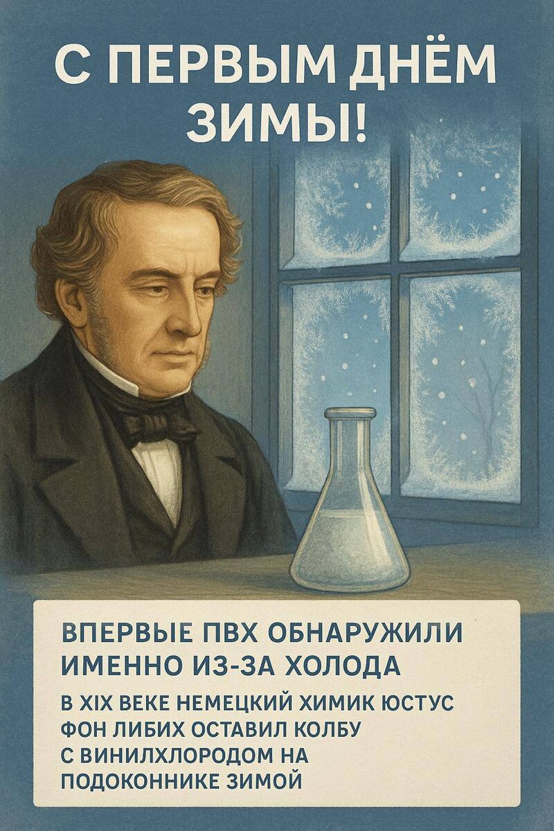 С первым днём зимы! Пусть этот сезон принесёт вам ясность, новые идеи и аккуратный, ровный финальный рывок года. И вот любопытный факт из истории пластиков, как раз «зимний»: 🔍 Впервые ПВХ обнаружили именно из-за холода В XIX веке немецкий химик Юстус фон Либих оставил колбу с винилхлоридом на подоконнике зимой. Когда весной он вернулся к эксперименту, внутри оказался белый твёрдый полимер — так мир впервые столкнулся с ПВХ, одним из самых востребованных пластиков в наше время. Иногда новые материалы рождаются не в больших лабораториях, а в моменты случайности. #интересное_plast @plast