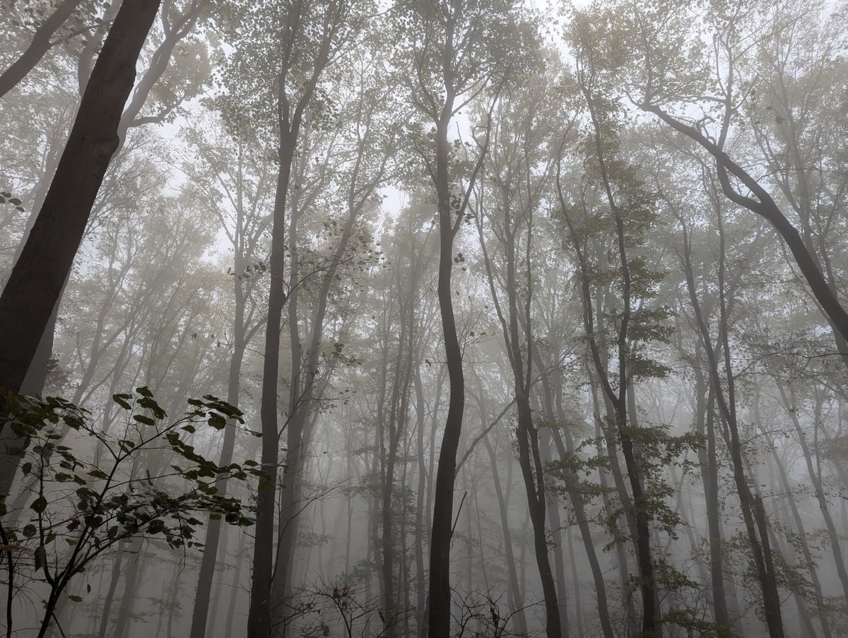В горы на автобусе Как ни странно, самым желаемым для посещения местом в стране для меня была Фрушка гора рядом с Нови-Садом. Не то что бы я знала о неё что-то невероятно интересное, просто про остальные места я не знала вообще ничего. Это не непосредственно гора, а природный парк. И слово «гора» тут, может, не очень уместно, потому что «высочайшая вершина» парка, согласно википедии, Црвени-Чот высотой 539 метров. Но я в любом случае люблю, когда из города можно сесть на общественный транспорт и оказаться на природе. И не важно, лес ли это или озеро. Я очень остро чувствовала, что мне этого не хватает, когда мы жили в Бишкеке. Природы там полно, а вот с общественным транспортом всё печально. Для посещения парка мы ждали погоды потеплее. Но время шло, наше отбытие из Сербии приближалось, а погода не улучшалась. Так что в последний мой выходной мы поехали как есть. В итоге не увидели ожидаемых мной видов с высоты, но зато… зато мы увидели такой потрясающий сказочный лес в тумане! Или