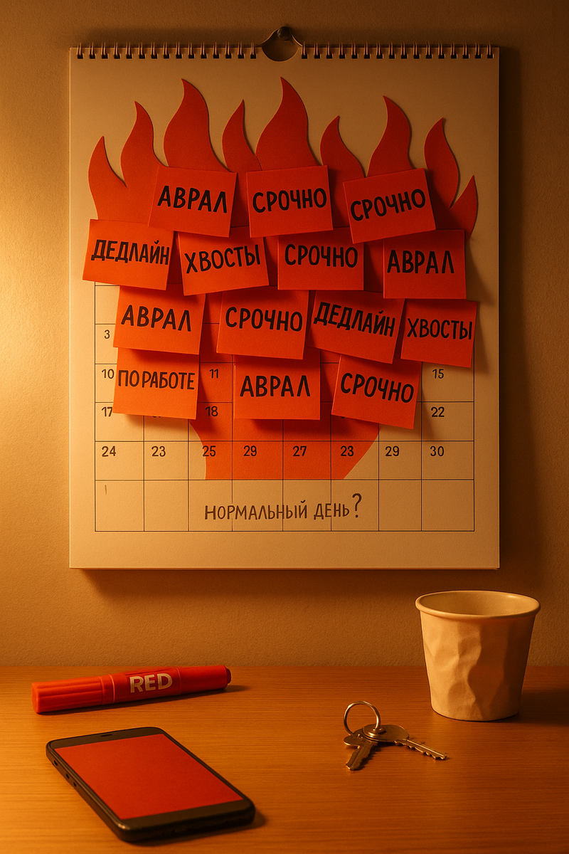 Честная картинка: жизнь идёт фоном, а аврал — главный герой.