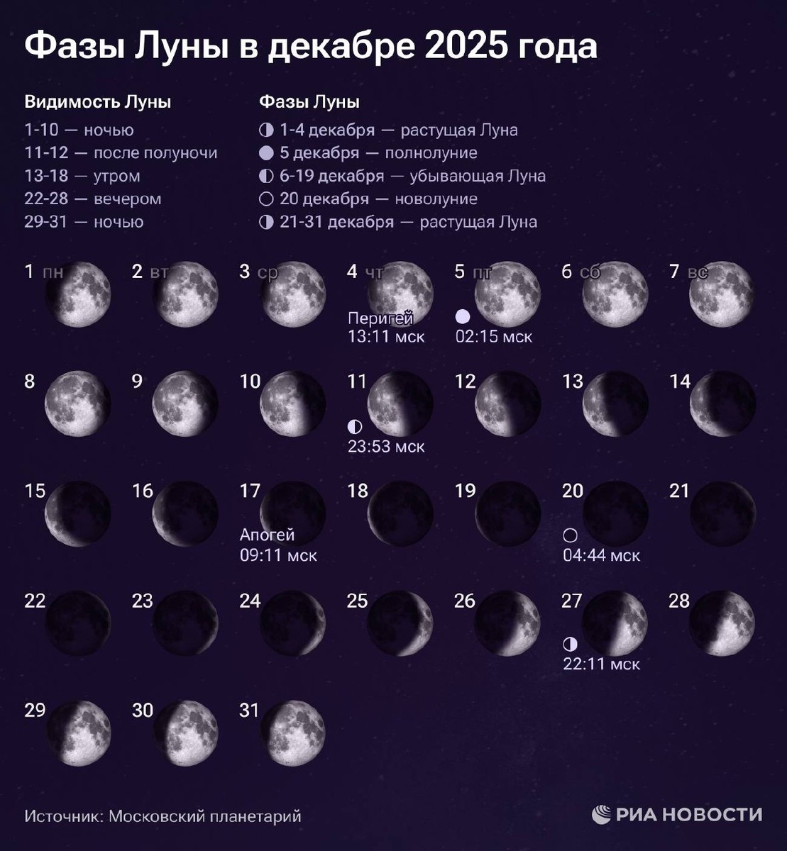 «Холодную Луну» можно будет увидеть в ночь на 5 декабря Полнолуние в декабре традиционно называют Холодной Луной – это последняя вершина лунного цикла в 2025 году, проходящая в период зимних дней и долгих ночей. С астрономической точки зрения полнолуние – это момент, когда Луна полностью освещена солнцем и находится напротив Земли. В декабре эта фаза особенно заметна на небе из-за высокой яркости и чистоты зимнего воздуха. «Холодную луну» можно будет увидеть в ночь на 5 декабря. Именно в этот день Луна окажется в нужном положении относительно солнца и земли, образуя идеально освещенный круг. Источник: Открыть