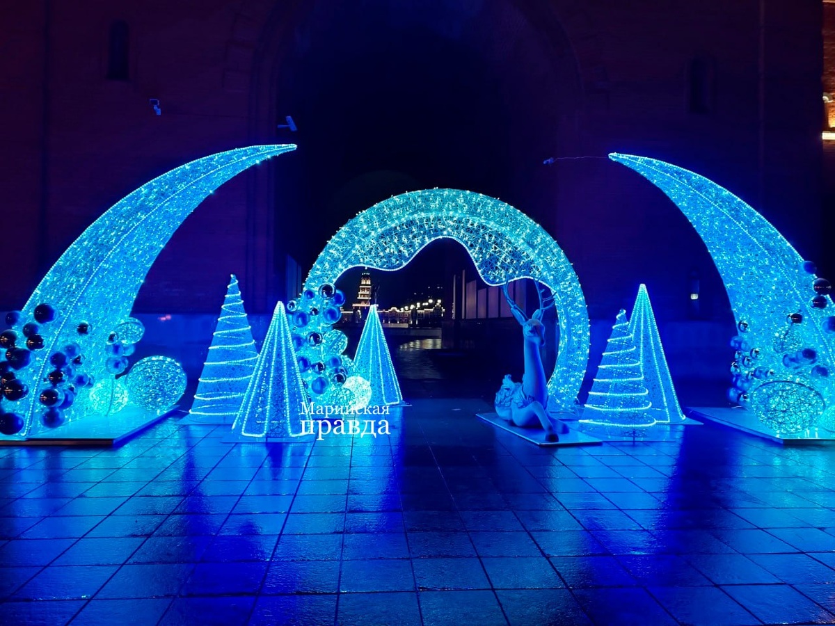 🦌 Первый день зимы пришел без снега, зато у Благовещенской башни в Йошкар-Оле появилась новая новогодняя инсталляция – сияющая арка