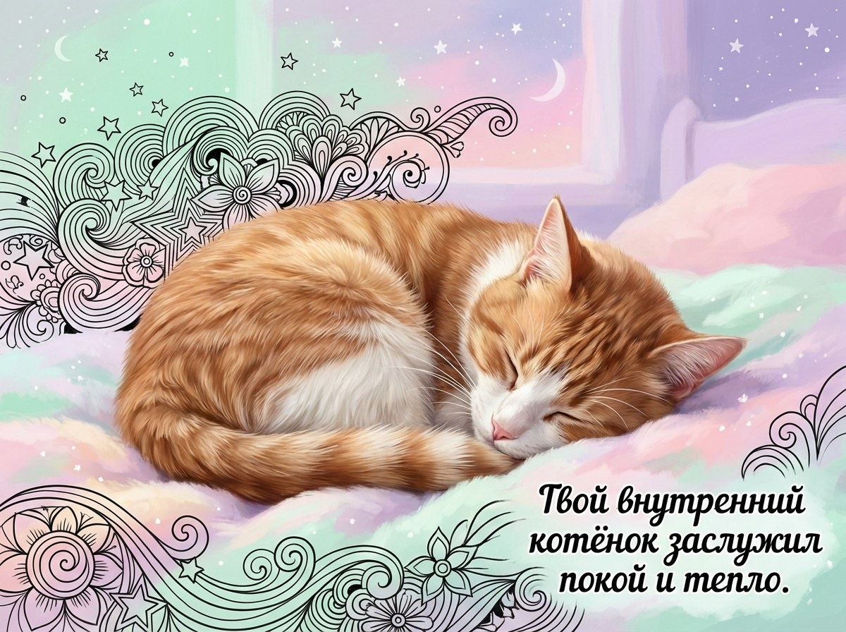 Когда вечер опускается на город мягкими бархатными лапами, позволь и своей душе свернуться уютным клубочком. Отпусти все тревоги прошедшего дня, пусть они растворятся в сумерках, словно тени на стене. Твой внутренний котёнок заслужил покой и тепло после долгого пути. Прислушайся к тихому мурчанию своего сердца — это мелодия твоего личного уюта, твоя колыбельная. Каждая мысль, что приходит сейчас, пусть будет мягкой и пушистой, как лапка спящего кота. Позволь себе погрузиться в дремоту, где время течет плавно, как молоко в блюдце, и каждый сон приносит только светлые образы. Ты в безопасности, ты дома, и ночь бережно укрывает тебя своим звёздным пледом.