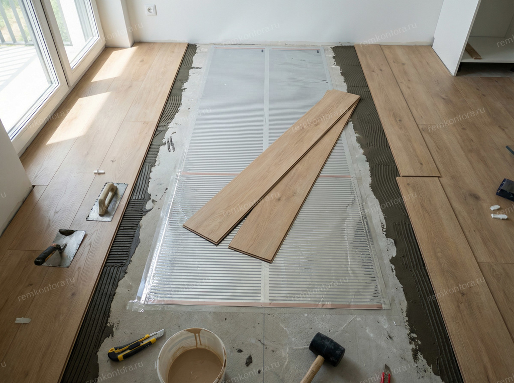 Плёночный тёплый пол удобен — тонкий, быстро ставится, недорогой. Но у него есть особенность: его кладут поверх стяжки, а не прячут внутрь. Поэтому сделать над ним нормальную клеевую систему почти нереально.