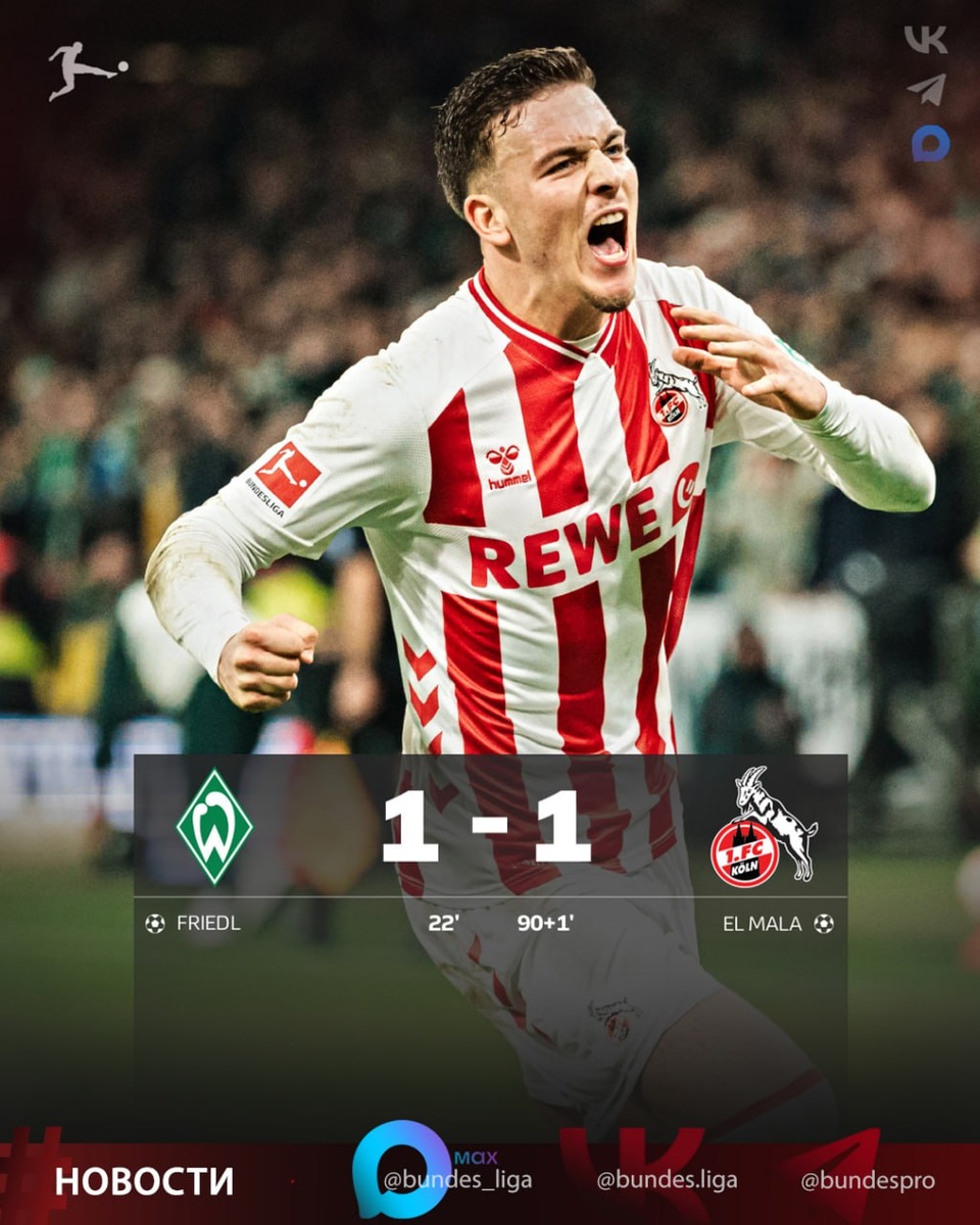 #Бундеслига ⚽️ 12 тур. «Вердер» - «Кёльн» 1:1 Бременские «музыканты» вели в счёте с 22-й минуты – за них забил Марко Фридль. Впрочем, удержать победный результат «Вердер» на своём поле не смог. На первой добавленной ко второму тайму минуте количество единиц на табло уравнял Саид Эль Мала. ⚡️После данного матча в активе бременцев 16 очков, с которыми он занимает 9-ю строчку турнирной таблице Немецкой Бундеслиги. В активе «Кёльна» 15 очков, с которым команда занимает 10 строчку турнирной таблицы. ⭐️ MAX -❤ Телеграм - ✅️Вконтакте