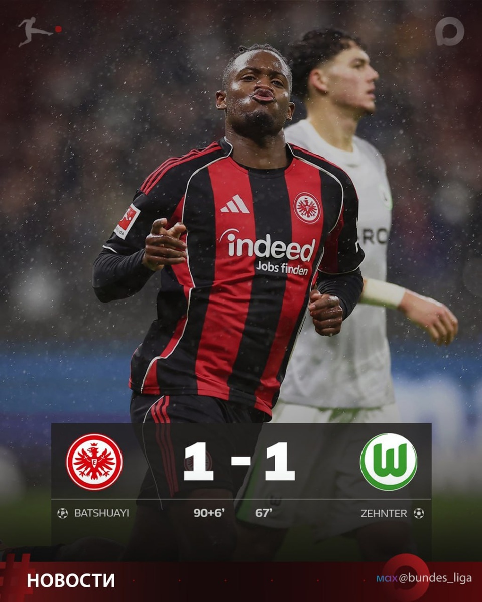 #Бундеслига ⚽️ 12 тур. «Айнтрахт» - «Вольфсбург» 1:1 ⚽️ Гости вышли вперед благодаря голу Аарона Центера на 67-й минуте. Хозяева сумели вырвать ничью в концовке — на 90+6-й минуте забил экс-форвард «Челси» Миши Батшуайи. ⚡️«Айнтрахт» (21 очко) занимает седьмое место в Бундеслиге. «Вольфсбург» с 9 очками идет 15-м в турнирной таблице. ⭐️ MAX