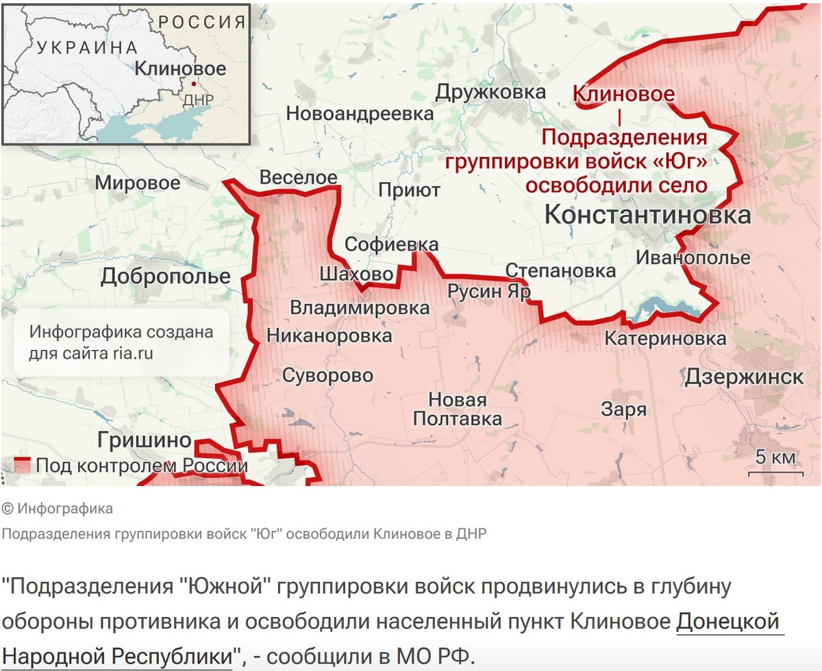 Начну с ошарашившего - освободили Кленовое. … убеждён – это авантюра с мизерными шансами на успех. Кленовое по меркам нынешней войны находится в тылу пр-ка, окружено со всех сторон мощными УР, опирающимися на куда большие села. Плюс рядом Дружковка. … Так же вчера НГШ доложил ВВП об осв-ии Красноармейска и Волчанска. Последнее сомнений не вызывает – по этому городу наши прошлись частым гребнем, зачистка там минимальна. Красноармейск же крупнейший из освобожденных нами городов после Бахмута-Артемовска. К тому же из окруженного Димитрова к своим постоянно пытаются пробиться вояки Хунты. … Уточнена ЛБС на левом берегу Оскола – в Купянском УР. Сейчас идут бои на северной окраине Петропавловки и вокруг Песчаного – полуокруженный противник постоянно контратакует. Не удаётся пока пробиться и в самом городе вдоль Оскола – от ст. Заосколье к Купянск-Узловому. На правом берегу продолжаются бои за Соболевку /оф-но освобождена летом/. Не удается пробиться пока к Садовому и далее на юг – к
