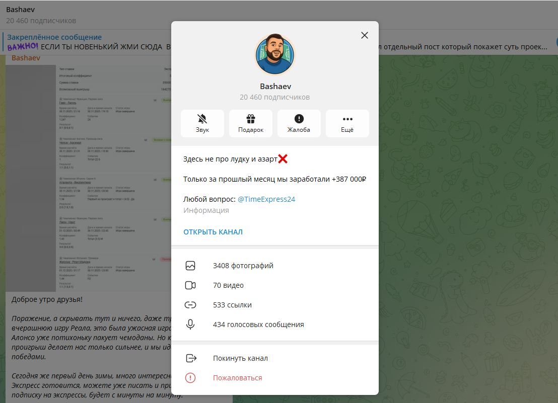 Телеграм-канал Bashaev обещает «революционные методики», «точную аналитику» и почти гарантированный доход на ставках. Автор уверяет, что теперь-то он нашёл формулу побед и готов делиться ей с подписчиками.
