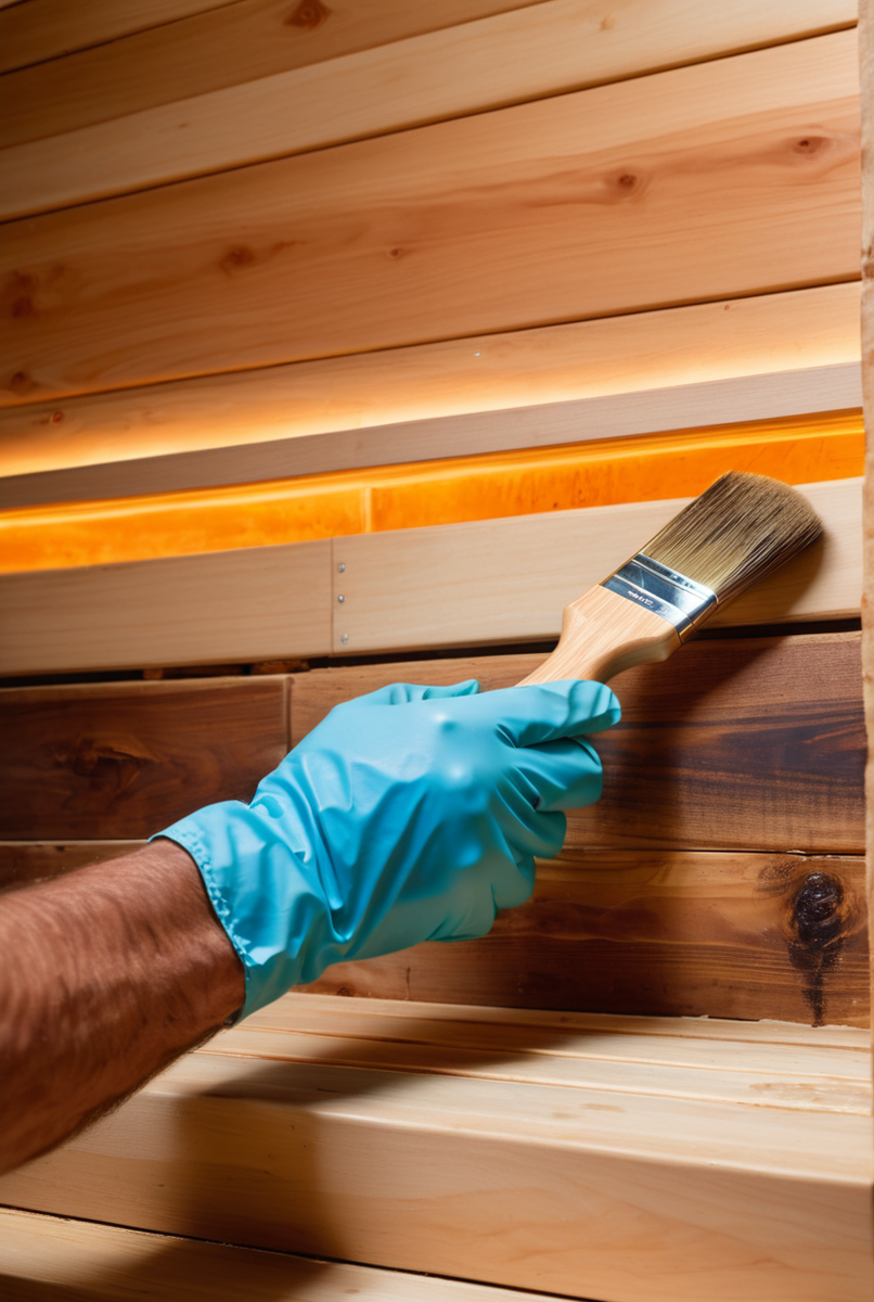 Далее следует обработка стен в парилке. Состав наносится тонким слоем вдоль древесных волокон. Не допускайте образования лужиц и излишков. Двигайтесь методично, доска за доской. Для улучшения проникающей способности чистое льняное масло можно слегка подогреть (до 40-50°C) на водяной бане, что сделает его более жидким. Это особенно актуально для плотных пород дерева. Тщательно прорабатывайте торцы и пазы вагонки, так как это самые уязвимые места для проникновения влаги. Весь процесс в парной должен проходить при хорошей вентиляции для обеспечения комфортной работы и правильной полимеризации масла.