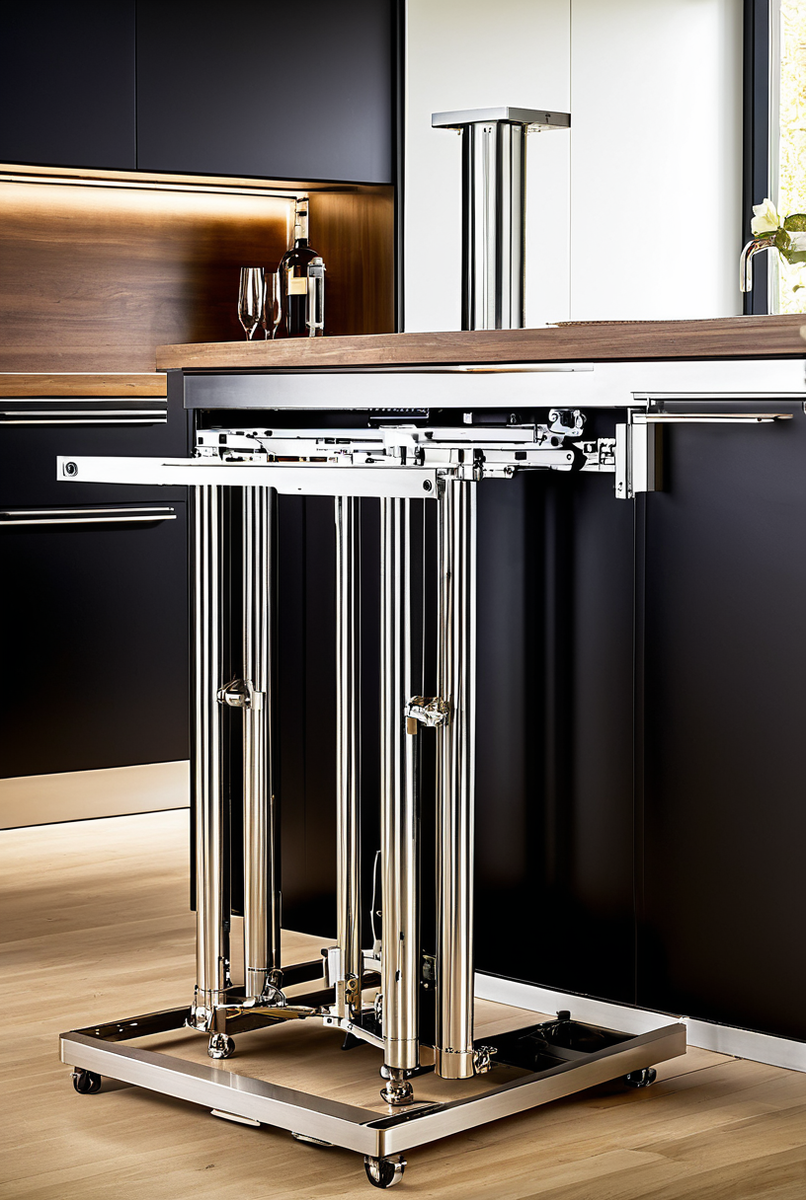 - Складной подъемник․ Лучший выбор для высоких шкафов․ Кухонный фасад из двух частей складывается при подъеме․ Ручка всегда остается в удобной зоне․