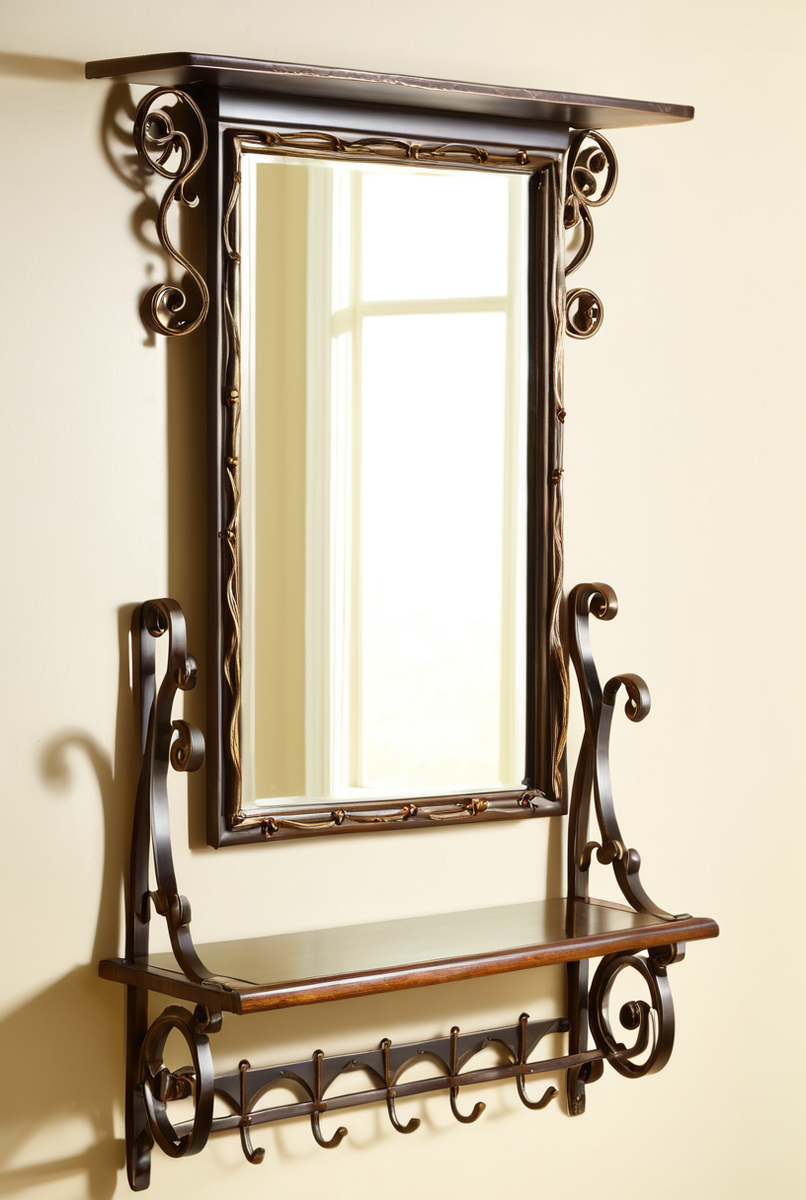 - Модели с зеркалом: Интегрированное зеркало — гениальное решение для экономии места. Металлическая вешалка, объединенная с зеркалом в единой кованой раме, позволяет быстро поправить прическу перед выходом. Такой элемент также визуально расширяет пространство, делая его светлее.