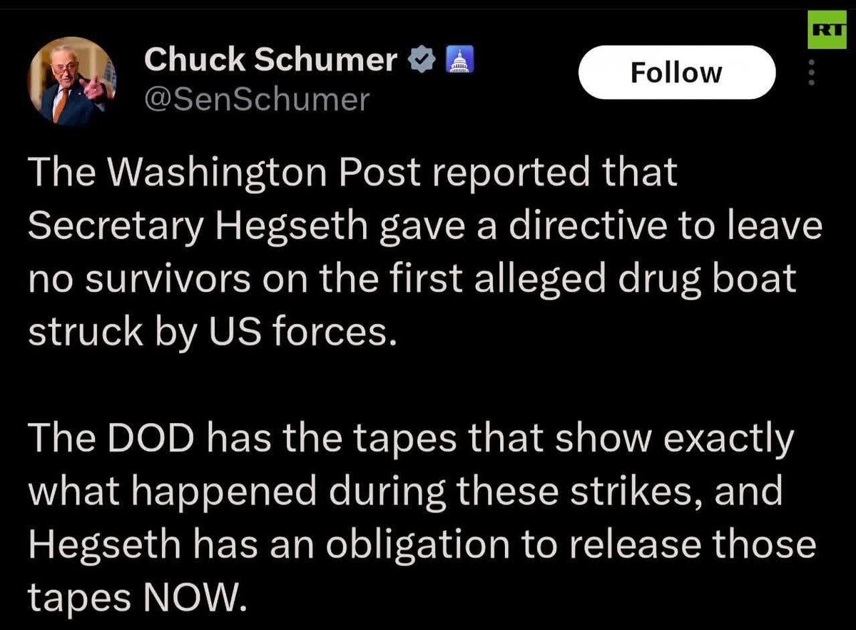 'Release the tapes NOW' — Schumer demands Hegseth reveal alleged 'kill all' order