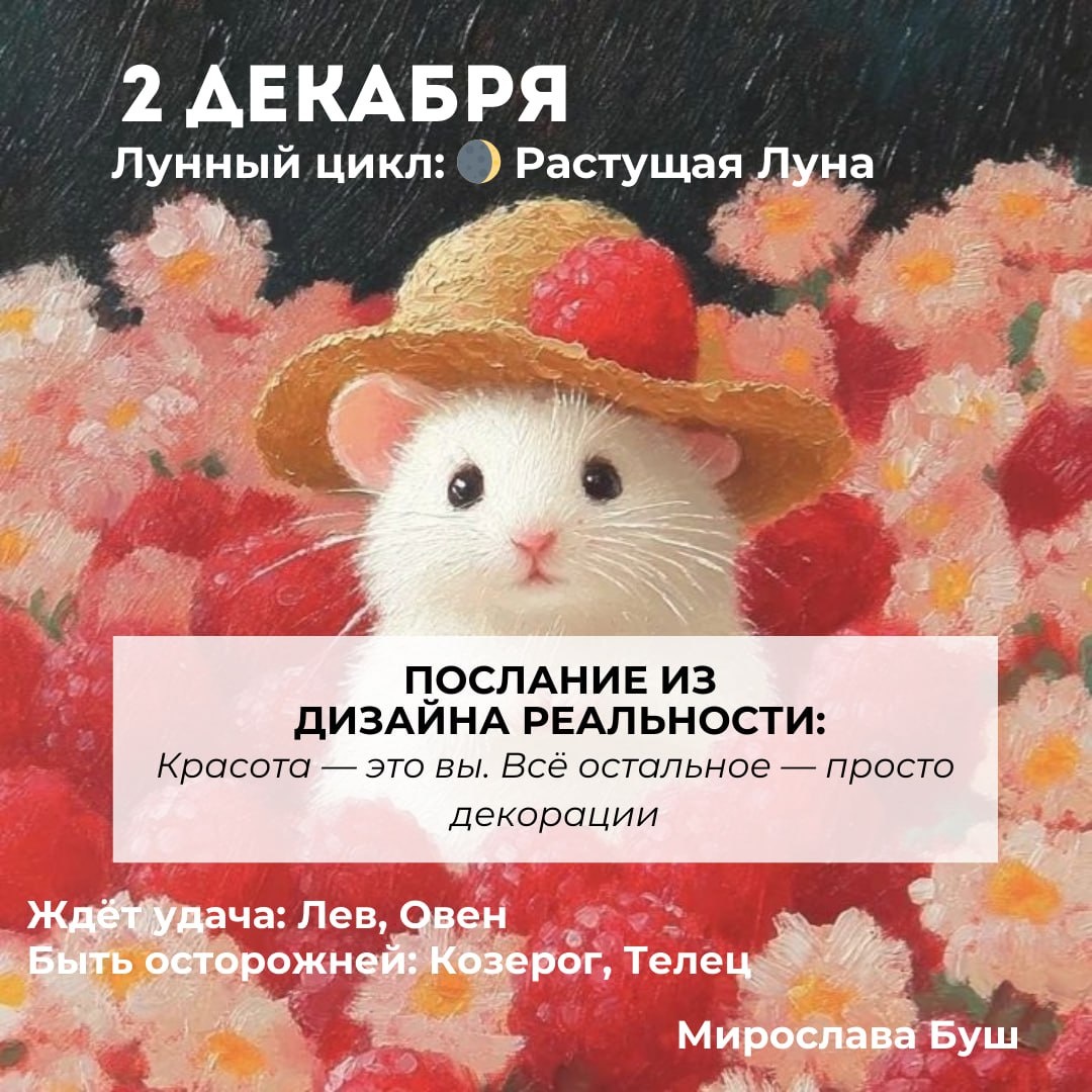 2 декабря РЕКОМЕНДАЦИИ: ☕️ Дайте себе паузу между действиями. Просто сядьте, сделайте глубокий вдох, выпейте стакан тёплой воды или чая. Дайте своему мозгу отдохнуть от лишнего шума и немножко расслабьтесь. 💌 Сделайте любой маленький шаг в будущее. Одно письмо, действие, звонок — что-то, от чего вы давно уклонялась. Сегодня подобные действия будут даваться легче, а результат точно вас порадует. 💕 Добавьте телу комфорта. Наденьте самую тёплую, уютную и любимую вещь, которая дарит ощущение, что вы везде "дома". ✉ Подписаться на Мирославу