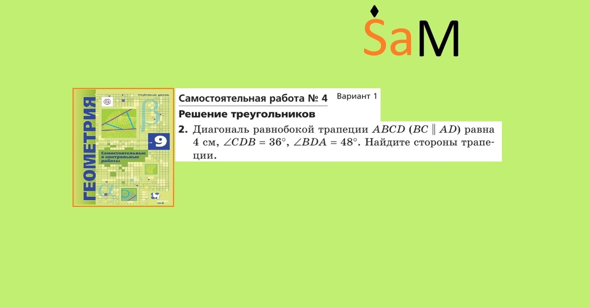Ссылка на разбор таблицы Брадиса:https://dzen.ru/video/watch/68d9412d411a922971b88972?share_to=link Мои каналы Дзен: https://dzen.ru/saintmath Vkвидео: https://vkvideo.ru/@club231069125 RUTUBE https://rutube.ru/u/sam/ Телеграм: t.me/saintmath Там можно также посмотреть задания в письменной форме и видео You Tube: https://youtube.com/@saintmath?si=3UAVLGN7XtMZxlpq Обратите внимание, что на ютуб выкладывается только часть видео, не весь контент! Геометрия 9 класс. Углубленный уровень. Мерзляк. Самостоятельная работа 4. Вариант 1. Решение треугольников. Диагональ равнобокой трапеции ABCD (где BC∥AD) равна 4 см, уголCDB = 36, уголBDA= 48. Найдите стороны трапеции. Хочешь видеть больше видео? Поддержи канал подпиской – это главный стимул расти дальше! #таблицыбрадиса #таблицабрадиса #синусы #косинусы