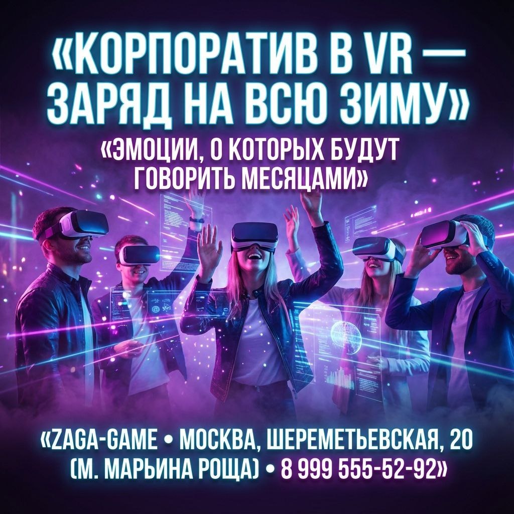 ⚡ Киберкорпоратив 2.0 — берём высоты с первой минуты! Забудьте банкет и конкурсы — у нас: 🎮 Кооп‑битвы и миссии на синхрон 🔥 Эмоции, о которых говорят неделями 🧩 Задачи на коммуникацию и стратегию 🛋 Лаунж после игры — обсуждаем эпик и поднимаем бокалы 1 час — и ваша команда заряжена на победы всей зимой. Действуйте! 🎯 ZAGA-GAME — тут начинается драйв. Успейте забить дату, пока декабрь ещё свободен. 📍 Адрес: Москва, ул. Шереметьевская, 20 (м. Марьина Роща) 📞 Телефон: 8 999 555‑52‑92 #ZAGAGAME #VR #VRМосква #VRарена #Корпоратив #КорпоративМосква #Тимбилдинг #VRигры #VRквест #КомандныйДух #МарьинаРоща #Шереметьевская #КлубРазвлечений #МоскваАфиша #ВечеринкиМосква #БронируйСейчас