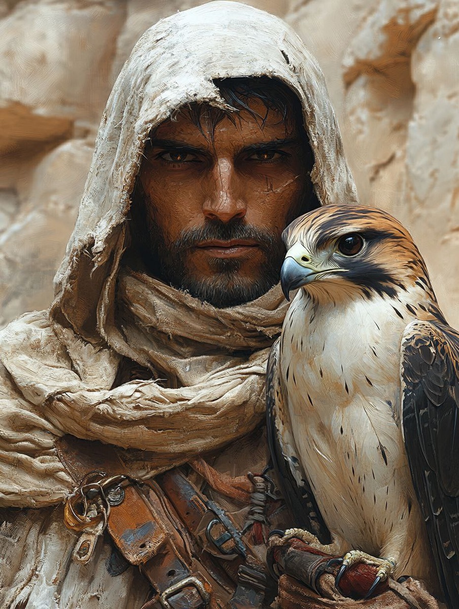 Detailed oil painting, dark fantasy style. A mysterious, atmospheric portrait of a person in traditional desert clothing holding a falcon. The artwork draws inspiration from Enki Bilal, blending realism and graphic novel style with muted, earthy colors and textured surfaces. The attire features detailed layers of fabric, leather straps, and intricate patterns, giving a sense of history and resilience. The falcon is depicted with precise feathers and an intense gaze, symbolizing strength and the bond with nature. The background is minimal and neutral, enhancing the evocative and enigmatic atmosphere --ar 3:4 --c 1 --w 1 --s 1000 --style raw --v 6.1