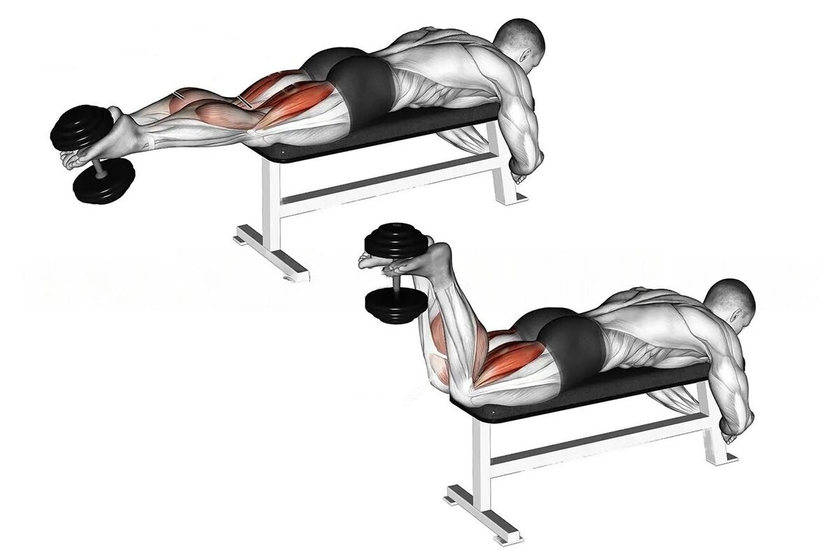 Сгибание ног лёжа с гантелью — изолирующее упражнение, направленное на проработку бицепсов бедра — группы мышц задней части бедра. Также в меньшей степени задействуются ягодичные мышцы и икры. Преимущества: развитие силы мышц задней поверхности бедра; формирование чёткого перехода между бицепсом бедра и ягодицами; улучшение гибкости бёдер; укрепление подколенных сухожилий. Техника выполнения Исходная позиция: Гантель нужного веса поставить вертикально на пол горизонтальной скамьи. Лечь на скамью лицом вниз. Поднять гантель с пола , закрепив её между ступней. Полностью вытянуть ноги. Руками обхватить скамью. Статически напрячь пресс. Взгляд направить вперёд. Движение: Вдохнуть и на выдохе начать сгибать ноги в коленном суставе, медленно приводя голень к ягодицам. Поднять гантель до угла 90 градусов. В верхней точке траектории зафиксироваться на 1–2 счёта и медленно и подконтрольно вернуться в исходное положение. Повторить заданное количество раз. Рекомендации: Следить за п