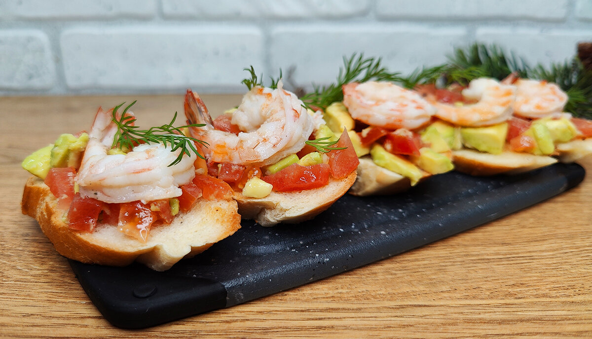 Здравствуйте, мои дорогие! Знаете, как бывает на праздниках: только вынесешь красивую тарелку с закусками — и вот уже кто-то украдкой тянется за второй кусочек, хотя ещё даже не успел сесть за стол. У меня есть как раз такая «опасная» закуска. Она пропадает быстрее, чем хозяева успевают сказать: «Берите, не стесняйтесь». И да, под рюмочку — она просто играет новыми красками. Сегодня покажу вам любимый рецепт, который ни разу меня не подводил. Он из той серии, где всё готовится быстро, просто, красиво — а вкус получается такой, что гости спрашивают: «А можно ещё?» И уже не важно, сколько блюд вы приготовили — вот это уйдёт первым. Проверено десятками застолий. 📌 Ингредиенты багет крупные королевские креветки авокадо — 1 шт помидор — 1 шт чеснок — 1 зубчик укроп для украшения растительное масло оливковое масло соль лимонный сок по желанию Рецепт Нарезаем багет порционными ломтиками и обжариваем на сухой сковороде до румяности. Переворачиваем, чтобы обе стороны подсохли слегка хрустящим