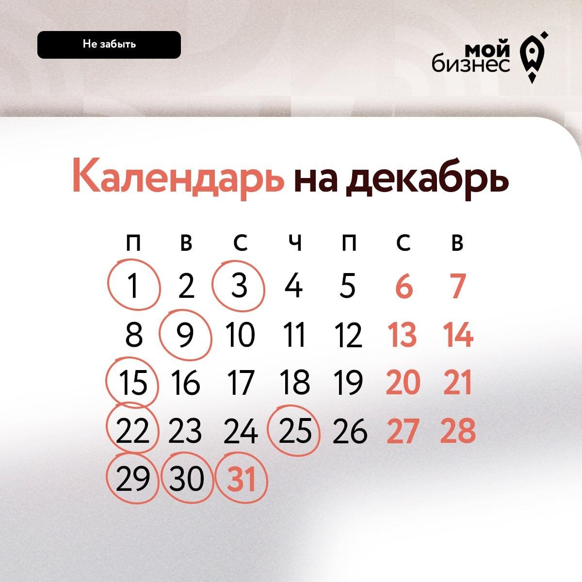 ❓О чём не забыть в декабре❓ Декабрь – первый месяц зимы и последний месяц года. Время подводить итоги и закрывать вопросы по бизнесу: не забываем про обязательные платежи – налоги, авансовые платежи, страховые взносы и НДС. Кроме того, в декабре предпринимателям важно учесть: 1️⃣ Рассчитывать утильсбор на автомобили нужно по новым коэффициентам 2️⃣ Стартует обязательная маркировка 4 новых групп товаров 3️⃣ Заканчивается упрощенный порядок ввоза немаркированных товаров из Казахстана и Киргизии 4️⃣ Истекает мораторий на плановые неналоговые проверки ИТ-компаний 👉 Для удобства подготовили «Календарь предпринимателя» на декабрь – смотрите его на нашем портале #Мойбизнес_оважном
