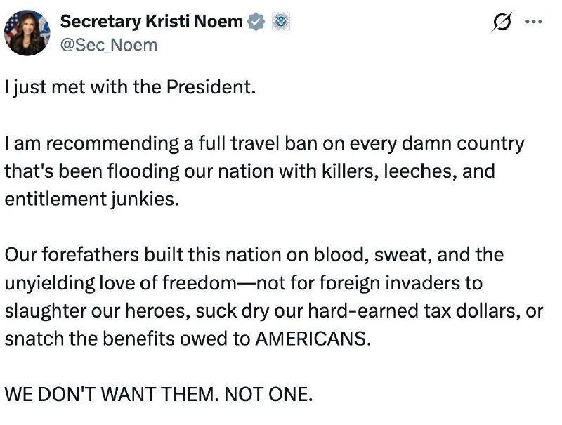 ‘WE DON'T WANT THEM. NOT ONE’ — DHS Sec Kristi Noem announces a ‘full travel ban on every damn country that's been flooding our nation with killers, leeches, and entitlement junkies’