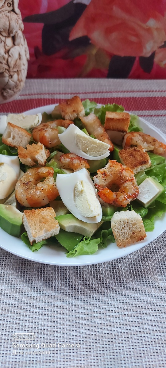 10 креветок 10 перепелиных яиц 4 ломтика белого хлеба 2 авокадо 1 лимон 150 г салата айсберг растительное масло соль, перец по вкусу Для приготовления сухариков с ломтиков белого хлеба срезать корки, нарезать хлеб небольшими кубиками и подсушить, помешивая, на сухой сковородке. Авокадо очистить, нарезать небольшими кубиками, переложить в салатник и обильно полить соком лимона. Перепелиные яйца сварить, остудить, очистить и разрезать пополам. Листья салата айсберг нарвать руками на небольшие кусочки и смешать с кубиками авокадо и половинками яиц. Креветки очистить от панциря, положить в сковороду с разогретым растительным маслом, посолить, приправить перцем и быстро обжарить с двух сторон. Накрыть крышкой сковороду, снять с огня, оставить на 5 минут, затем выложить в салатник. Заправить салат небольшим количеством растительного масла, посолить, поперчить и посыпать сверху сухариками. #салат #салатсавокадо #салатскреветками #салатсавокадоикреветками