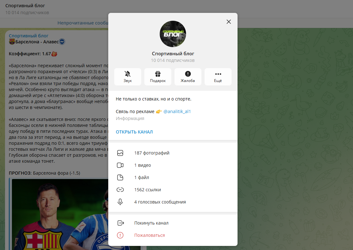 Это может указывать на накрученных подписчиков, что у ставочных каналов встречается постоянно — так создают иллюзию популярности. Контент — смесь спортивных новостей и намёков на прогнозы. Полноценной аналитики нет, разборы поверхностные, а публикации часто служат подводкой к