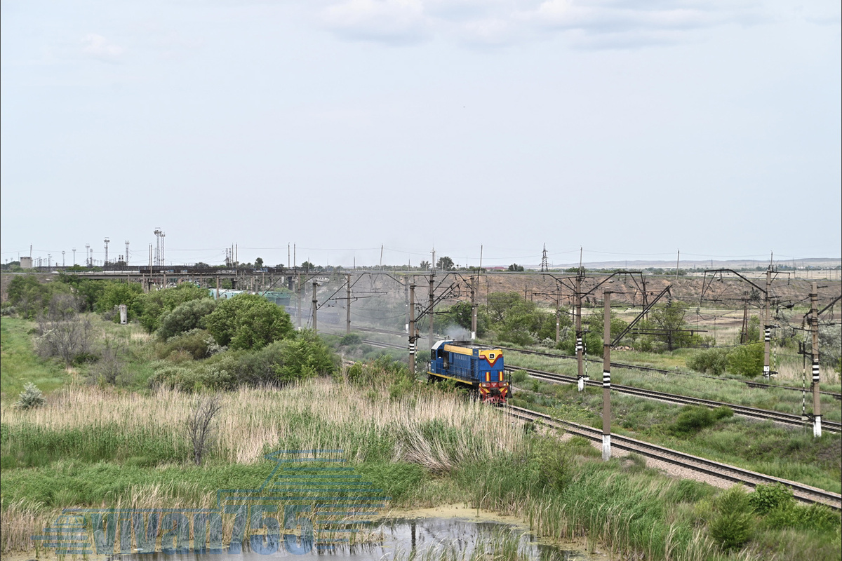 Это 2ТЭ10ВК-КН, таких на весь Казахстан было, если не изменяет память, то ли 9, то ли 12, осталось 4, из них в Караганде 2 – в основном возят уголь всю на ту же ТЭС. Он сделан из советского тепловоза 2ТЭ10В с заменой кузова на капотный, но сохранением старой кабины: