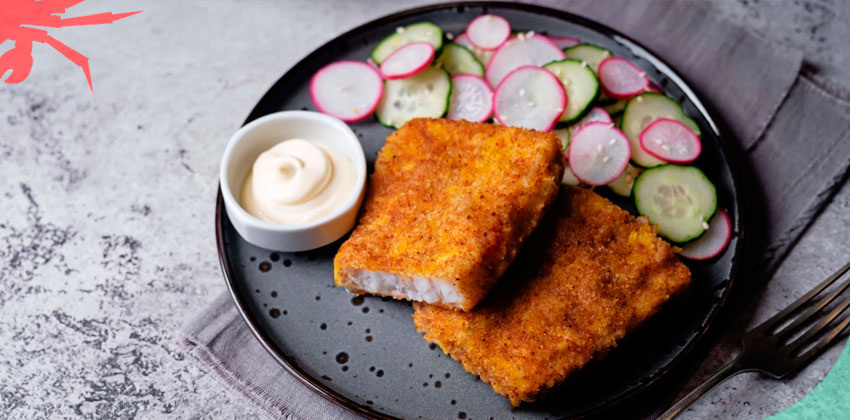 Ингредиенты: - филе минтая 200 г - оливковое масло 1 ст. ложка - панировочные сухари 50 г - соль ½ ч. ложки - паприка ½ ч. ложки - молотый чили ¼ ч. ложки - молотый чёрный перец ¼ ч. ложки - сушёный чеснок ¼ ч. ложки - сушёный лук ¼ ч. ложки Натираем куски филе маслом со всех сторон. Смешиваем панировочные