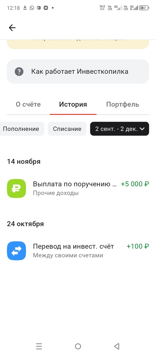 Доброго времени суток, уважаемый читатель. Захотелось поделиться приятной новостью с остальным миром)). Как можно понять со скриншота в октябре я открыл инвест копилку и пополнил её на минимальные 100 рублей. Сподвигло меня на это действие предложение от Альфа-Банка. Дословно уже не помню, но предполагалось открыть копилку, пополнить и получить шанс на приз. Что собственно я и сделал😁. И забыл про неё. Сегодня от Альфы пришло сообщение, что инвест копилка меняет состав фондов. И зайдя в неё с удивлением узнал что там не 100 рублей, а 5 124 руб. В рамках Розыгрыша в ноябре мне добавили ещё 5 000. К тому же набежало 0,5% дохода или 24 руб 🤔. Деньги оказались вполне реальные. При запросе на вывод ответили: пожалуйста, в часы работы Биржи и будет удержан налог на доход. 650 рублей уйдёт государству. И ведь деньги дармовые, а всё равно жалко 😂. В конце недели скорее всего обналичу. Когда то давно Альфа-Банк предлагал поучаствовать на пару в инвестициях. Обманули! Как и было условлено