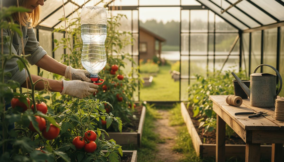 Про расход воды и «расчёт капельного полива» по простому. В нормальном летнем режиме на одно растение томата у нас уходит от литра до двух в сутки, но это если вы поливаете лейкой по поверхности. Капельный полив для растений работает точнее, вода идёт прямо в зону корней, поэтому фактическая потребность ниже. Мы ориентируемся на литр в день у взрослого куста в жару и 0,5 литра в умеренную погоду. Отсюда легко считать, сколько бутылок и какого объёма вам нужно на грядку. Если теплица большая, можно связать бутылки в «гребёнку» — соединить их тканевыми жгутами, которые ведут к двум-трём растениям. Такой фитильный полив мы пробовали на двух грядках, хорошо работает на перцах, потому что у них корневая ближе к поверхности.