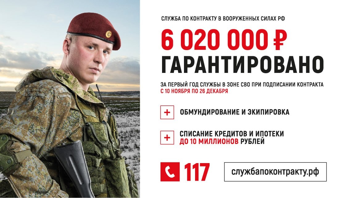 🖌Служба по контракту ❗️За первый год службы на СВО гарантированная выплата 6 млн рублей - при подписании контракта с 10 ноября по 26 декабря. 📞117 ______________________________________________________________ 🌐 Сайт | 📱 Тelegram | 📱 ВК |📲 ОК