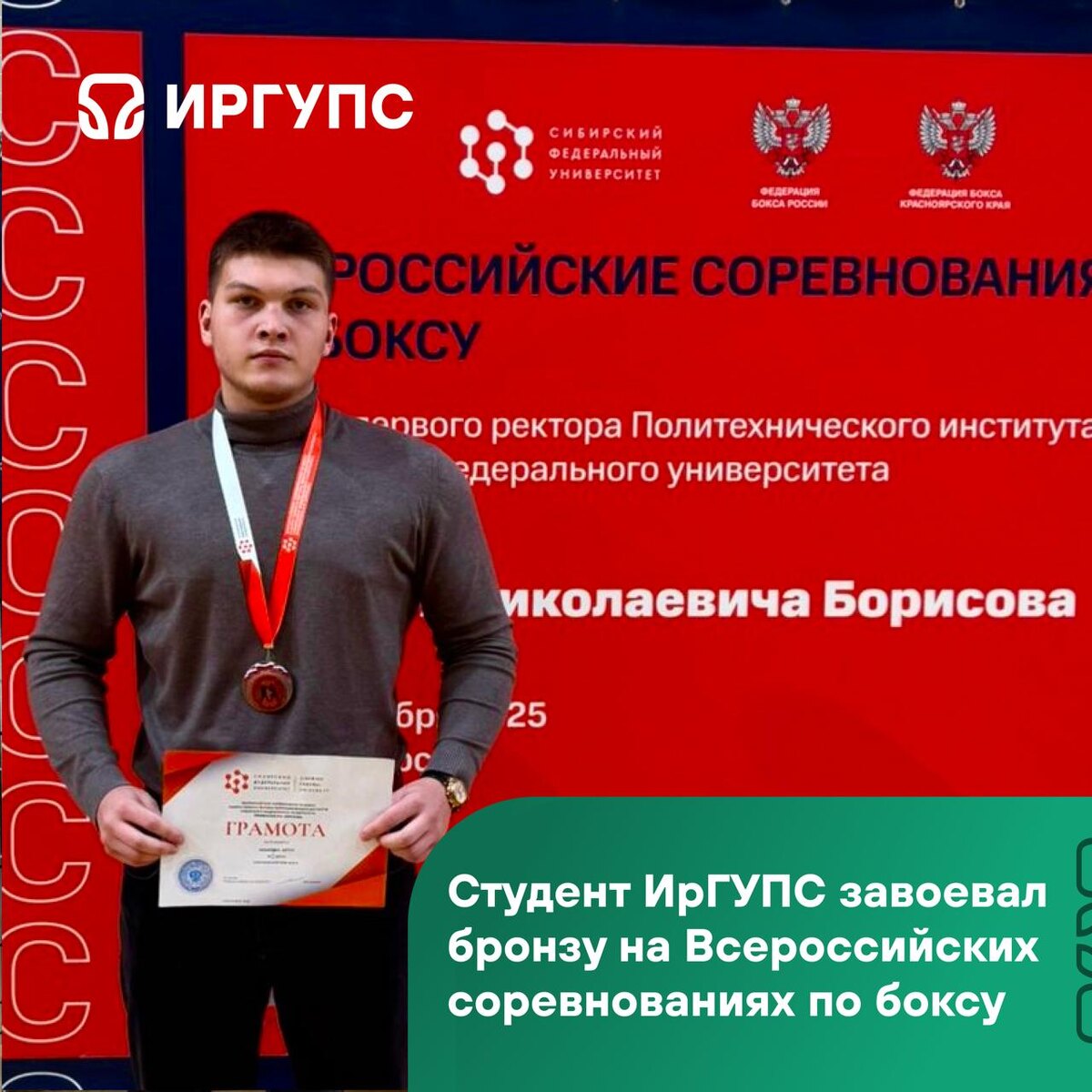 #ИрГУПС_спортивный Студент ИрГУПС завоевал бронзу на Всероссийских соревнованиях по боксу С 24 по 30 ноября в Сибирском федеральном университете состоялись Всероссийские соревнования по боксу памяти первого ректора Политехнического института СФУ, профессора Василия Николаевича Борисова. 🥉 Студент ФУТиИТ Артур Хабардин вышел в полуфинал, заняв 3 место. Поздравляем Артура с высоким спортивным достижением!