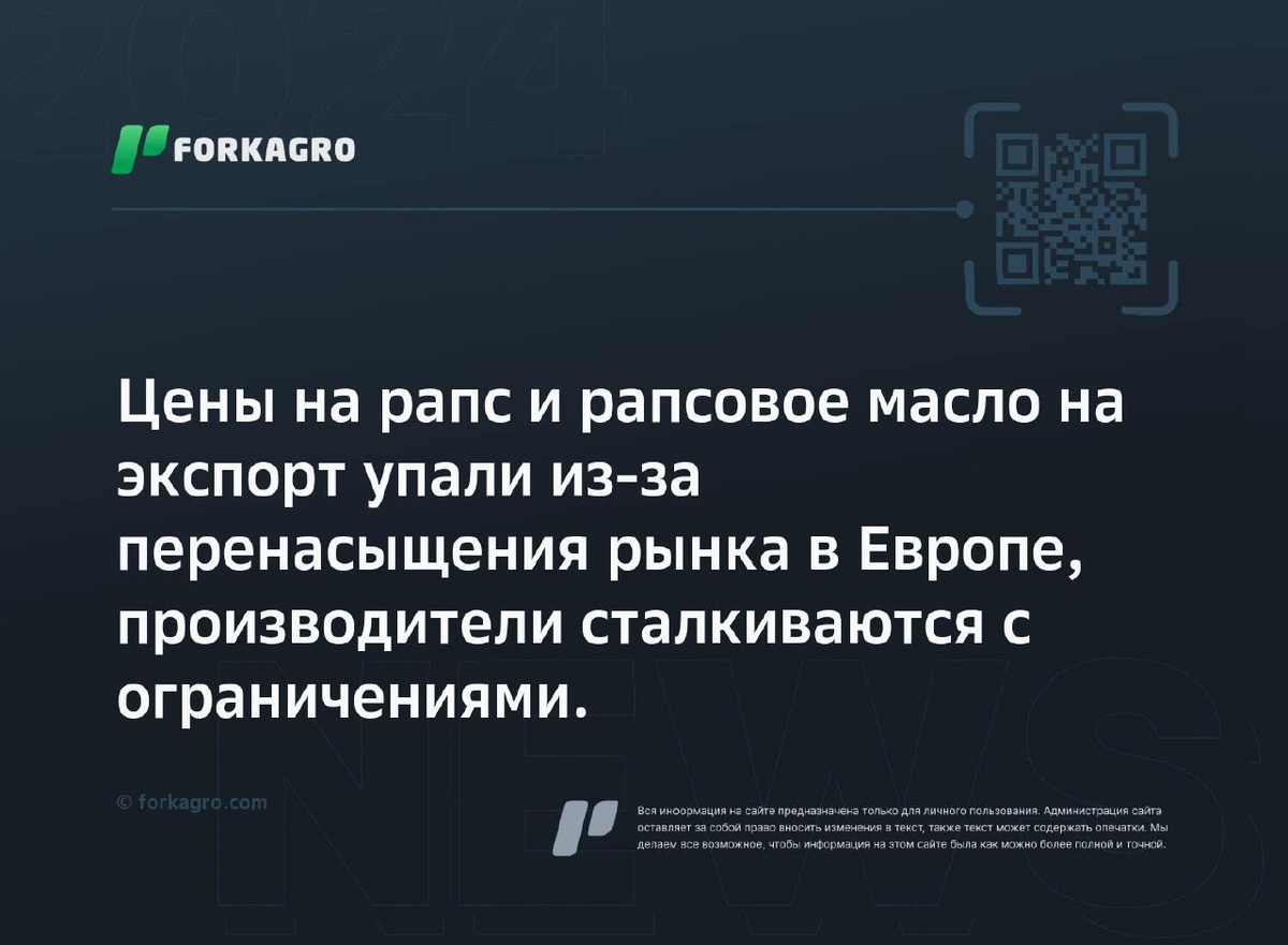 Цены на рапс и рапсовое масло на экспорт упали из-за перенасыщения рынка в Европе, производители сталкиваются с ограничениями. На мировом рынке цены на экспорт рапса снизились из-за избытка товара в Европе и падения цен на рапсовое масло. Предложения масла из рапса пытались увеличить, но столкнулись с ограничениями из-за дешевизны продукции в ЕС. Цены на рапсовое масло в Украине оставались в рамках 24000-24500 гривен за тонну. Подробнее о рынке масличных культур можно узнать из еженедельных обзоров. Перейти к источнику