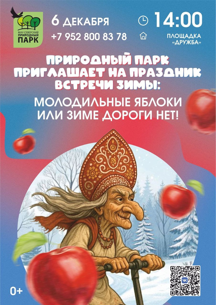 Приглашаем 6 декабря в 14:00 на народное гулянье, посвященное встрече зимы, которое состоится на площадке «Дружба» в парке⛄ Для вас: 🎶 Концерт народного ансамбля «Садко» 🎭 Театрализованное представление «Молодильные яблоки или - Зиме дороги нет!» 🤩 Массовые игры и забавы с народными традициями Праздник в природном парке — это возможность вновь почувствовать себя ребенком, наслаждаясь белоснежной красотой зимы и сказочным чудом. Не упустите шанс погрузиться в атмосферу зимнего волшебства и провести незабываемый день с семьей и друзьями!🎉 ❄️ Обратите внимание: если температура опустится ниже -15°C, мероприятие будет отменено или перенесено. Следите за погодными условиями и берегите себя! #СеверскАфиша #Северск #ПаркСеверск #Афиша #ВстречаЗимы #Праздник