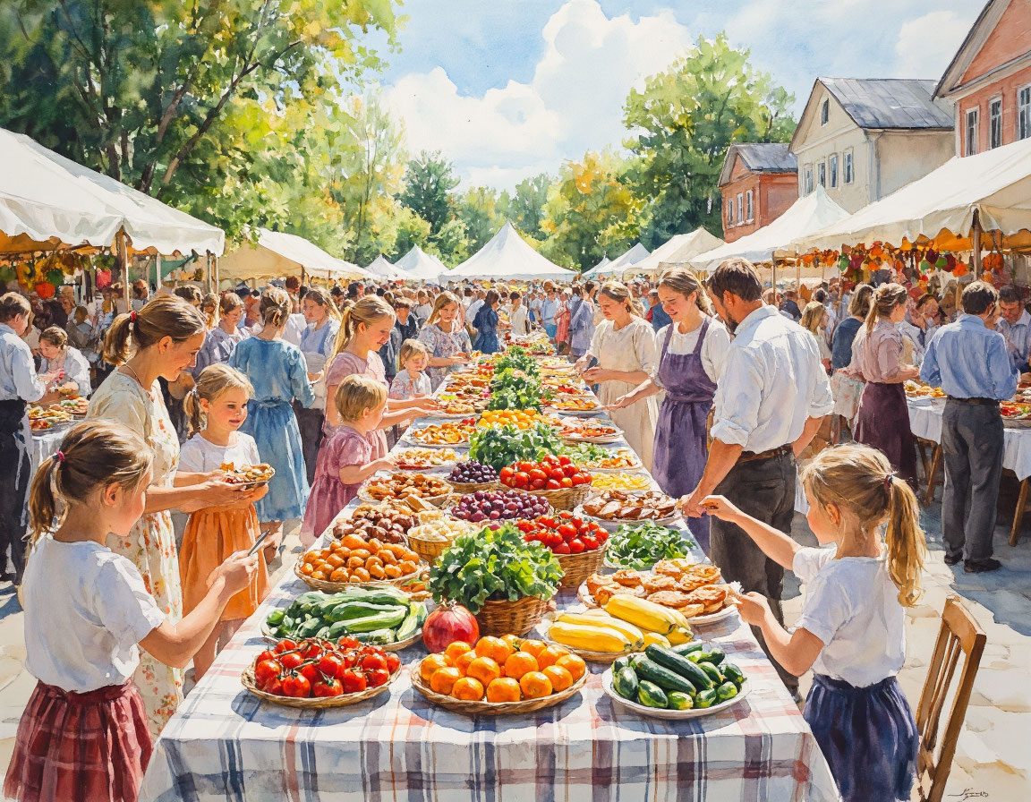 Атмосфера была пронизана таким теплом и единением, что его можно было почти осязать. Смех, задорные мелодии, доносящиеся из динамиков, возгласы одобрения в адрес хозяек, звон ложек о тарелки — все это сливалось в единую, радостную симфонию жизни.