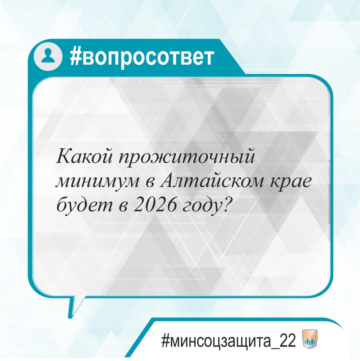 ❔Какой прожиточный минимум в Алтайском крае будет в 2026 году? 💬Здравствуйте! Прожиточный минимум в Алтайском крае на 2026 год: ▶️В целом по краю в расчете на душу населения - 16 856 руб. ▫️Для трудоспособного населения - 18 373 руб. ▫️Для пенсионеров - 14 496 руб. ▫️ Для детей - 16 350 руб. 📍Постановление Правительства Алтайского края от 07.11.2025 № 426 Подробнее 👉 https://clck.ru/3FgJJN * Вопрос поступал через систему "Инцидент Менеджмент" #Алтайскийкрай #Минсоцзащита_22 #Вопросответ