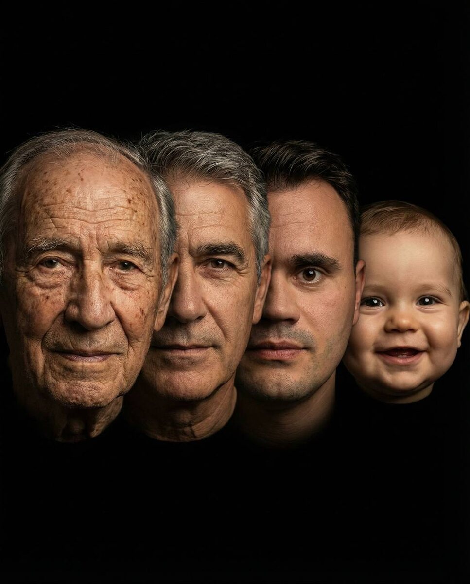 Генерация поколений. Попросили поделиться промтом. Подгружаем свою фотографию и потом отправляем промт An artistic studio portrait showing four generations of men from the same family lineage, arranged in a HORIZONTAL ROW from left to right. The faces are positioned side by side, slightly overlapping, creating a seamless horizontal sequence. All faces are based on [Image1], showing the same person aged differently while maintaining consistent genetic features. From LEFT to RIGHT in a horizontal line: first an elderly man in his 80s with deep wrinkles, weathered skin, gray thinning hair, wise expression. Next to him overlapping slightly, a mature man in his 50s-60s with salt-and-pepper hair, defined facial lines, dignified look. Next, a young man in his late 20s-30s matching [Image1] exactly, smooth skin, full dark hair, confident expression. On the far right, a happy smiling baby boy around 1 year old with soft chubby cheeks, bright innocent eyes, joyful smile. All four faces are ar