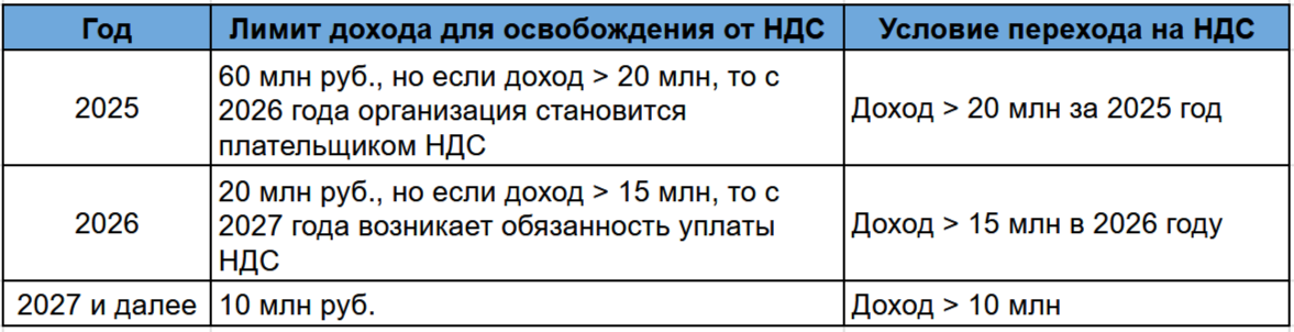 - Если доход за 2025 год не превышает 20 млн, то с 1 января 2026 года сохраняется освобождение от НДС.