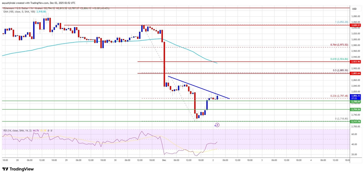 🎯 Ethereum под давлением, но покупатели удерживают ключевые уровни 📈 Цена ETH упала ниже $2,880 и $2,800, но пытается восстановиться с отметки $2,718. Текущая цена ETH составляет $2795.84, с падением на 1.56% за последние 24 часа. На данный момент Ethereum торгуется ниже $2,850 и 100-часовой простой скользящей средней. Несмотря на снижение, покупатели проявляют активность, защищая ключевые ценовые минимумы, предотвращая дальнейшее падение до $2,650 и ниже. Возможно восстановление, если цена пробьет сопротивление на уровне $2,880. 📊 Ключевые моменты: - Ethereum не смог удержаться выше $2,950, начав новое снижение. - Важные уровни сопротивления: $2,820, $2,880 (50% Фибо отката), $2,920. - Прорыв выше $2,920 может открыть путь к $3,000 и $3,050. - Основные уровни поддержки: $2,760, $2,740, $2,720.