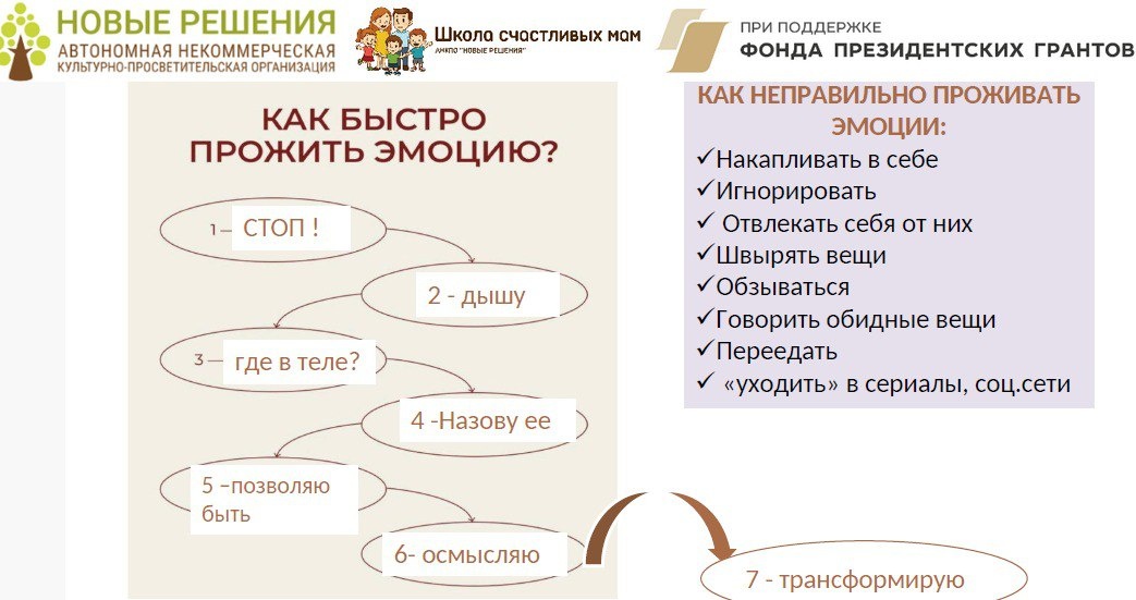 🤔КАК ПОНИМАТЬ И ПРИНИМАТЬ ЭМОЦИИ СВОИ И РЕБЕНКА 💕Вебинар начался с благодарности всем участникам, которые делают маленькие шаги в заботе о себе, тем, кто делится в группах своими успехами и трудностями, а также поддерживает других лайками, словами. Описание участниками конкретных ситуаций дает всем полезные уроки и идеи. 🏗️Своеобразным промежуточным подведением итогов работы с эмоциями стало знакомство с 4 ступенями фундамента пути к себе: Ступень 1. Управляю эмоциями. Ступень 2. Принимаю. Ступень 3. Влияю. Ступень 4. Проявляюсь. ✅Проведенный участниками самоанализ помог выявить то, с чем еще надо работать: «Думаю, что мне нужно направить внимание на управление эмоций, реалистичное восприятие возможностей других людей и не завышать ожидания». «Для укрепления фундамента мне нужна самодисциплина и больше свободного времени на себя, потому что иногда сил не хватает». ❗Только родитель, умеющий сотрудничать со своими эмоциями и проживать их, сможет научить подростка справляться со св