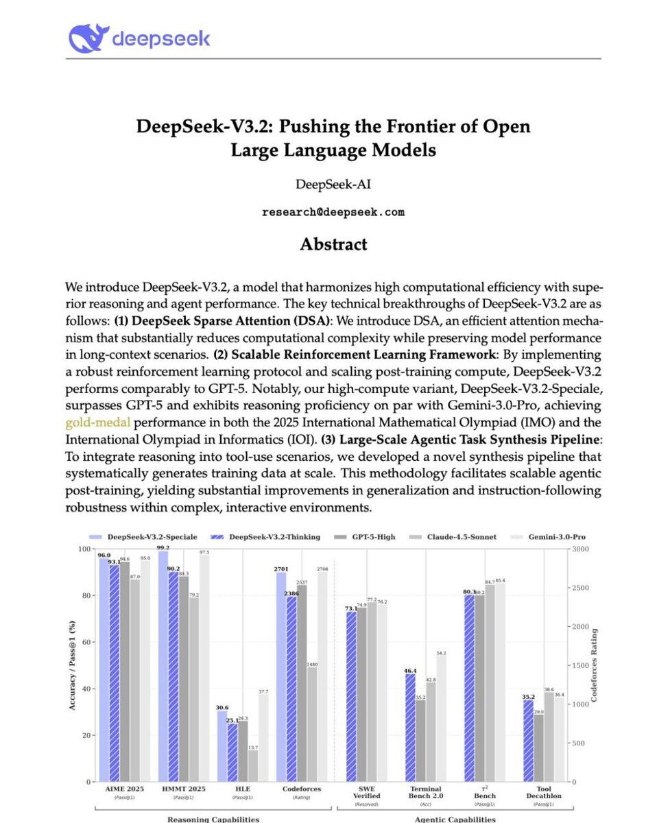 🐋 DeepSeek выкатили не «ещё одну модель», а полноценную топ-систему уровня IMO/IOI/ICPC - при этом обучение и генерация стоят в десятки раз дешевле, чем у GPT-5 и Gemini 3 Pro. Главное: • DeepSeek-V3.2-Speciale обгоняет Gemini 3.0 Pro в математике и коде • Новая флагманская модель совмещает рассуждения + агентность • Архитектура MoE из семейства V3.1 Terminus, контекст 128k • Главное нововведение — DeepSeek Sparse Attention (DSA), сделанный ради дешёвого длинного контекста Что делает DSA Обычное внимание - O(T²), что больно при 128k токенов. DSA снижает стоимость до O(T·U), где U - только небольшое число релевантных токенов. Как работает: 1) Lightning Indexer - лёгкая сеть оценивает важность каждого прошлого токена 2) Fine-grained top-k - модель выбирает только самые полезные токены и считает внимание по ним Как обучали Начали с чекпоинта V3.1 (128k) и сделали 2-ступенчатое дообучение: • Stage 1 - плотное внимание, замороженная модель, обучается только DSA • Stage 2 - постепенный