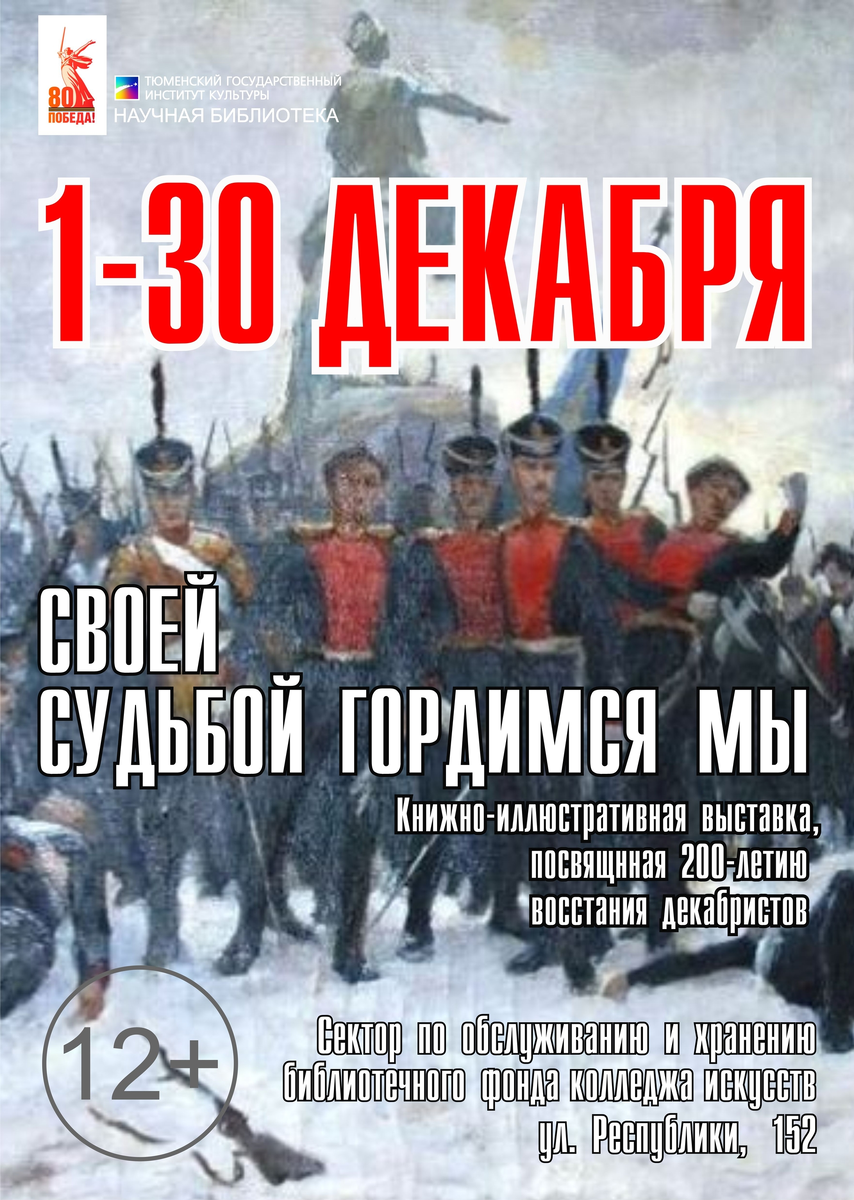 В читальном зале колледжа искусств (ул. Республики, 152, ауд. 1103) научной библиотеки ТГИК открыта книжно-иллюстративная выставка «Своей судьбой гордимся мы», посвящённая 200-летию со дня восстания декабристов Прошло уже 200 лет с того декабрьского дня, когда раздался залп пушек на Сенатской площади, но мы и сейчас вспоминаем героев того памятного времени. Настоящая выставка рассказывает о людях, ставших двигателями восстания 14 декабря, заплативших высокую цену за попытку преобразовать Россию, спасти ее от деспотизма самодержавия. Герои войны 1812 года мечтали перенести на родную почву то, что видели в просвещенной Европе во время заграничного похода русской армии. Они стали объединяться в тайные общества, деятельность которых вылилась в попытку государственного переворота – восстание декабристов. На основе архивных документов сейчас реконструируются события от подготовки и хода восстания на Сенатской площади до драматического поражения декабристов. В экспозиции находятся редки