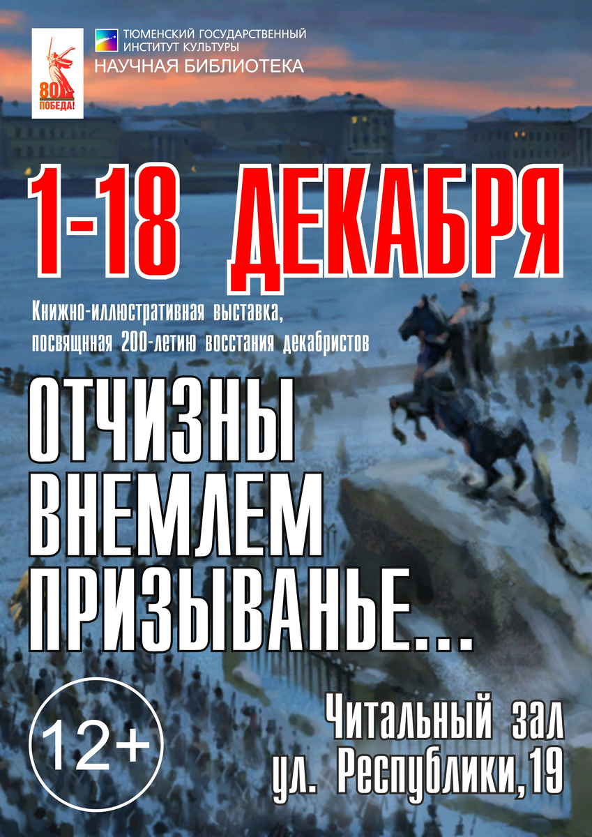 В читальном зале научной библиотеки ТГИК (ул. Республики, 19. каб. 109) открылась книжно-иллюстративная выставка «Отчизны внемлем призыванье …», приуроченная к 200-летию восстания декабристов (14 декабря 1825 года). Декабристское восстание — это «трагическое столкновение благородных мечтаний и суровой реальности», когда офицеры-единомышленники, вдохновленные идеалами свободы, вышли на Сенатскую площадь 14 (26) декабря 1825 года. Они пытались остановить восшествие на престол Николая I, чтобы свергнуть самодержавие и отменить крепостное право. Несмотря на героическое выступление, восстание было жестоко подавлено, а его участники понесли суровое наказание, но их попытка навсегда осталась символом борьбы за лучшую Россию. В экспозиции выставки представлены не менее 73 изданий художественной, научной и учебной литературы. В первом разделе выставки собраны энциклопедии и учебная литература про исторический период возникновения и формирования декабристского движения. Движения прогрессив