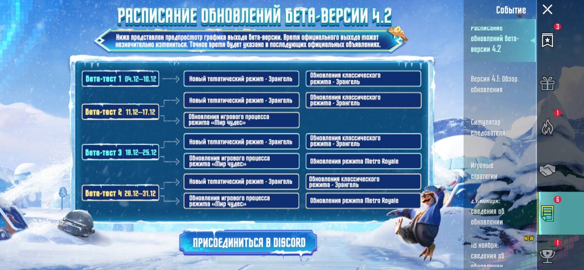 Расписание обновлений бета-версии 4.2 🔫 - бетка обновления 4.2 начнет выходить уже 4 декабря, но возможны изменения в графике Ждете? 😎 💓Бот 24/7 - @prostibrouc_bot ✅Магазин UC -https://t.me/ProstiBro_uc 👍 - ждемс 👎 - не-а 🔥 - я уже в предвкушении