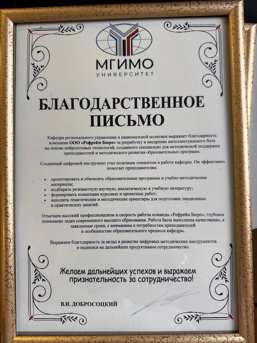 🎓 МГИМО х Рефрейм Бюро = полезный результат 🌐 В деятельности каждой компании, в том числе и такой молодой, как наша, есть ориентиры и события, которые позволяют определить, каким путем ты хочешь идти. Одним из смыслов нашей деятельности с момента самого основания является желание реализовывать продукты и проекты, которые будут полезны людям 📚10 лет назад 2 основателя Рефрейм Бюро поступили на один факультет в МГИМО. Мы отучились сначала на бакалавриате, а потом вместе на магистратуре. Наши пути на какой-то период разошлись, но спустя десять лет с момента поступления мы создали компанию. Еще спустя несколько месяцев получили очень ценную для нас благодарность, которой хотим поделиться с вами 🏅Мы смогли реализовать для одной из самых больших кафедр МГИМО – Кафедры регионального управления и национальной политики – один полезный проект: создали и передали в использование нейросетевого бота. Этот инструмент помогает преподавателям проектировать программы, подбирать литературу и выст
