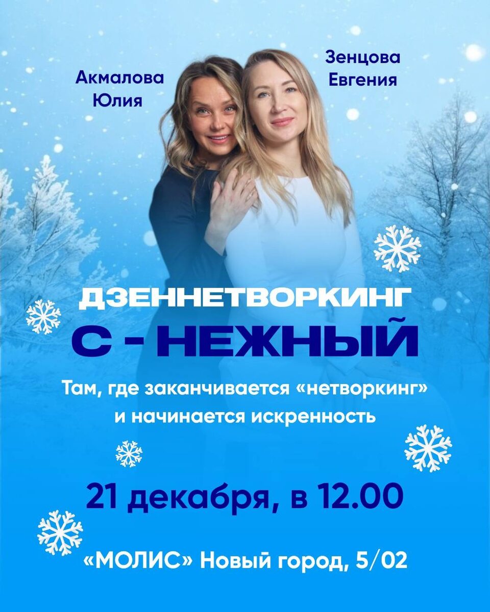 «С-НЕЖНЫЙ ДЗЕННЕТВОРКИНГ» Друзья, мы с Евгенией Зенцовой https://t.me/zentsova_pro приглашаем вас на уникальную встречу ❄️Когда ? 21 декабря ❄️Время! В 12.00 «С-Нежный Дзеннетворкинг» — пространство, где мы сознательно замедляемся, чтобы ускорить настоящее доверие. Что будет? ✅Игровой формат общения ✅Представление каждого участника и его самопрезентация ✅Колоборации с единомышленниками ✅Усиление проектов ✅Создание новых идей и продвижение ✅Вкусная еда Для кого? Для предпринимателей, руководителей, экспертов и творческих личностей, которые устали от поверхностного общения и верят, что: Личный бренд строится не только на достижениях, но и на репутации надежного и человечного партнера. Умение вкладываться в отношения, поддерживать и развивать их — ключевой навык для долгосрочного успеха. Чем полезен? Это инвестиция в качество ваших связей. Вы уйдёте не просто со списком контактов, а с ощущением близости, с пониманием, как превращать знакомства в надёжные отношения, и с вдохновение