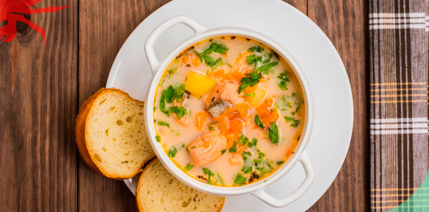 Ингредиенты: - свежая сёмга 500 г - вода 2 л - чёрный перец горошком по вкусу - лавровый лист по вкусу - зелень сельдерея по вкусу - соль по вкусу - лук 1 штука - морковь 1 штука - сливочное масло 30 г - средний картофель 4 штуки - сливки 20% жирности 125 мл - пармезан 150 г - петрушка по вкусу Нарезаем мякоть рыбы средними кубиками, заливаем водой и ставим на