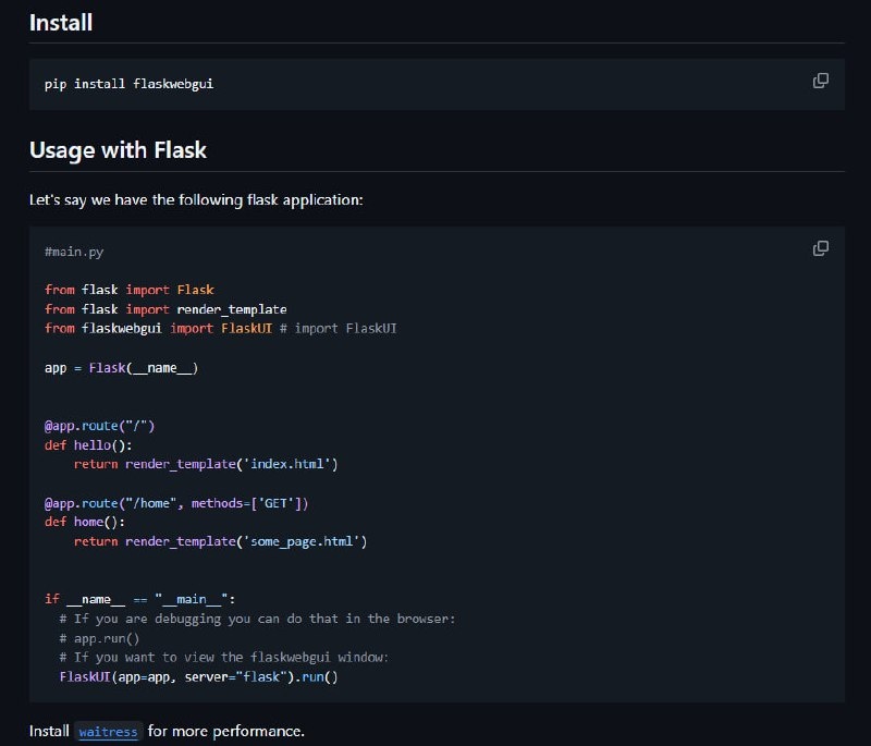 GUI-ΡΡΠ΅ΠΉΠΌΠ²ΠΎΡΠΊΠΎΠ². π΅ΠΠΎΠ΄Π΄Π΅ΡΠΆΠΈΠ²Π°Π΅Ρ HTML/CSS/JS-ΠΈΠ½ΡΠ΅ΡΡΠ΅ΠΉΡΡ ΠΊΠ°ΠΊ ΠΏΠΎΠ»Π½ΠΎΡΠ΅Π½Π½ΡΠΉ GUI. π΅ΠΠΎΠ·Π²ΠΎΠ»ΡΠ΅Ρ ΡΠΏΠ°ΠΊΠΎΠ²Π°ΡΡ ΠΏΡΠΈΠ»ΠΎΠΆΠ΅Π½ΠΈΠ΅ Π² standalone-ΠΈΡΠΏΠΎΠ»Π½ΡΠ΅ΠΌΡΠΉ ΡΠ°ΠΉΠ». π΅Π Π°Π±ΠΎΡΠ°Π΅Ρ Π½Π° Windows, Linux ΠΈ macOS. π΅ΠΠΎΠ΄Π΄Π΅ΡΠΆΠΈΠ²Π°Π΅Ρ ΠΏΠ°ΡΠ°ΠΌΠ΅ΡΡΡ ΠΎΠΊΠ½Π° (ΡΠΈΡΠΈΠ½Π°, Π²ΡΡΠΎΡΠ°, fullscreen ΠΈ Ρ.Π΄.). π΅Π‘ΠΎΠ²ΠΌΠ΅ΡΡΠΈΠΌ Ρ PyInstaller. β‘οΈΠ£ΡΡΠ°Π½ΠΎΠ²ΠΊΠ° Π±ΠΈΠ±Π»ΠΈΠΎΡΠ΅ΠΊΠΈ: pip install flaskwebgui π± Π Π΅ΠΏΠΎΠ·ΠΈΡΠΎΡΠΈΠΉ β‘οΈΠ‘ΠΏΡΠ°Π²ΠΎΡΠ½ΠΈΠΊ ΠΡΠΎΠ³ΡΠ°ΠΌΠΌΠΈΡΡΠ°. ΠΠΎΠ΄ΠΏΠΈΡΠ°ΡΡΡΡ