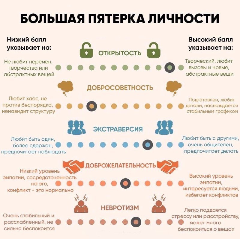 Просто о сложном: что такое «Большая пятерка» личностных черт. Знакомы ли вы с тестами, которые обещают за 5 минут определить ваш «тип личности» — например, «интроверт» или «экстраверт»? Часто они бывают слишком упрощенными. А что если бы существовал более тонкий и научный инструмент, описывающий не тип, а ваш уникальный личностный профиль? Познакомьтесь с «Большой пятеркой» (или OCEAN) — золотым стандартом в современной психологии личности. Что это такое? «Большая пятерка» — это не тест, а модель, которая описывает личность по пяти основным, независимым друг от друга измерениям (чертам). Представьте, что ваша личность — это звуковой миксер с пятью регуляторами. У каждого из нас свой «узор» настроек. Аббревиатура OCEAN помогает запомнить эти пять шкал: 1. O — Openness (Открытость опыту) · Что это? Готовность пробовать новое, интерес к искусству, эмоциям, приключениям, необычным идеям. · Высокий уровень: Вы любознательны, креативны, с богатым воображением. Вам комфортно в мире фа