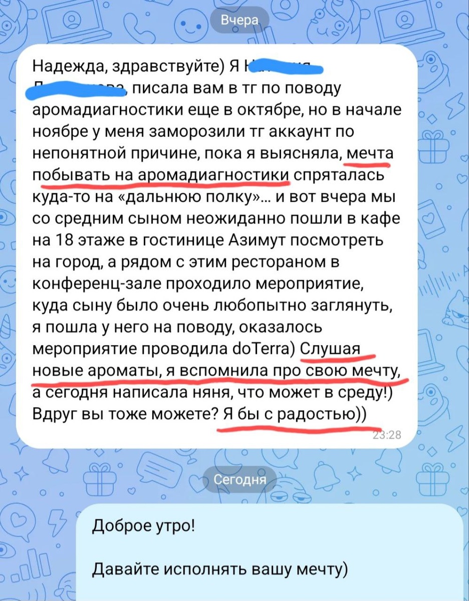 #пишетМама Всем привет! ❄️ Как вы? Не расстраиваетесь из-за перебоев в работе мессенджеров и интернета?) А у нас то-ли не смотря, то-ли вопреки этому всё очень сильно насыщенно: и по очереди болеющие дети, и вопросы с различными документами, и культурно-праздничная сторона жизни! Особенно же приятно среди этого всего получать вот такие сообщения👆👆 Когда ты можешь исполнить чью-то мечту и сделать его жизнь вкуснее, наполненнее, лучше — это безценно! Это очень сильно воодушевляет и двигает вперёд!🔥🔥 А у вас какие мечты?😉 #эфирыВпомощь #мечта #аромадиагностика #слушаяСебя