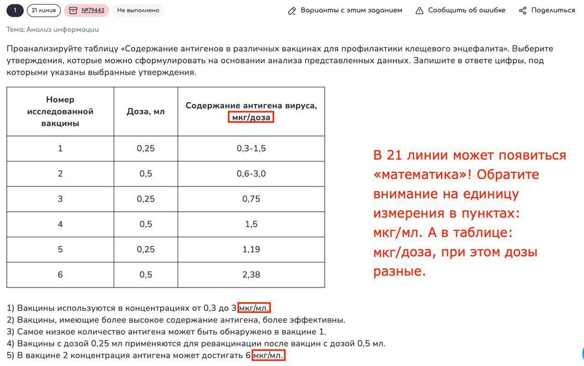 На всероссийском съезде учителей биологии и математики показали интересное задание 21-й линии. Ответ: 35 Дело в единицах измерения, которые нужно верно перевести. Раньше такого не встречалось! Объясняю, в чем тут прикол 🥸 В таблице нам дано содержание антигена в мкг/доза, а при этом доза — это не 1 мл жидкости! Для простоты давайте возьмем вакцину №2, у нее доза = 0,5 мл. Давайте посмотрим на утверждение №5 — «В вакцине 2 концентрация антигена может достигать 6 мкг/мл.» Обратите внимание, что в утверждении используется уже другая единица измерения — не мкг/доза, а мкг/мл. Значит, нам нужно перевести данную в таблице мкг/дозу (для 2-й вакцины максимальное значение — 3,0 мкг/доза) в мкг/мл! Как нам это сделать? Давайте заменим слово «доза» на конкретное значение (из таблицы для вакцины №2) — 0,5 мл. Тогда получится, что содержание антигена: 3,0 мкг/0,5 мл. Ну и умножаем на 2, получается 6,0 мкг/1 мл. То есть 6 мкг/мл. Значит, утверждение №5 — верное! Проще говоря, если дано, что